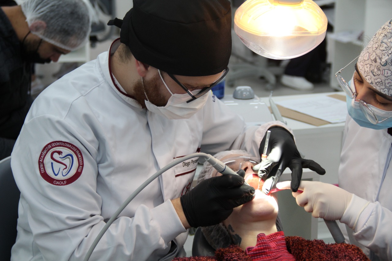 Procedimento de restauração realizado pela acadêmica, do 6º período, Thais Caroline Alves, do UniBrasil, em paciente com deficiência visual hereditária.
