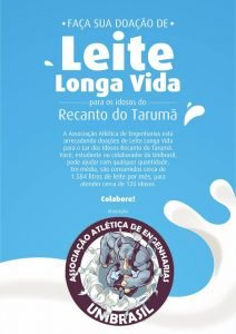 Em média, o Lar dos Idosos Recando do Tarumã, necessita aproximadamente 1.584 litros de leito por mês, par atender os 120 idosos que vivem no espaço, localizado ao lado do UniBrasil. Ciente dessa necessidade e buscando promover ações socais em prol da comunidade, a Associação Atlética de Engenharias (AAEU) do UniBrasil Centro Universitário estará arrecadando durante todo o mês de setembro, caixas de leite Longa Vida para uma ação social em prol do Lar.
