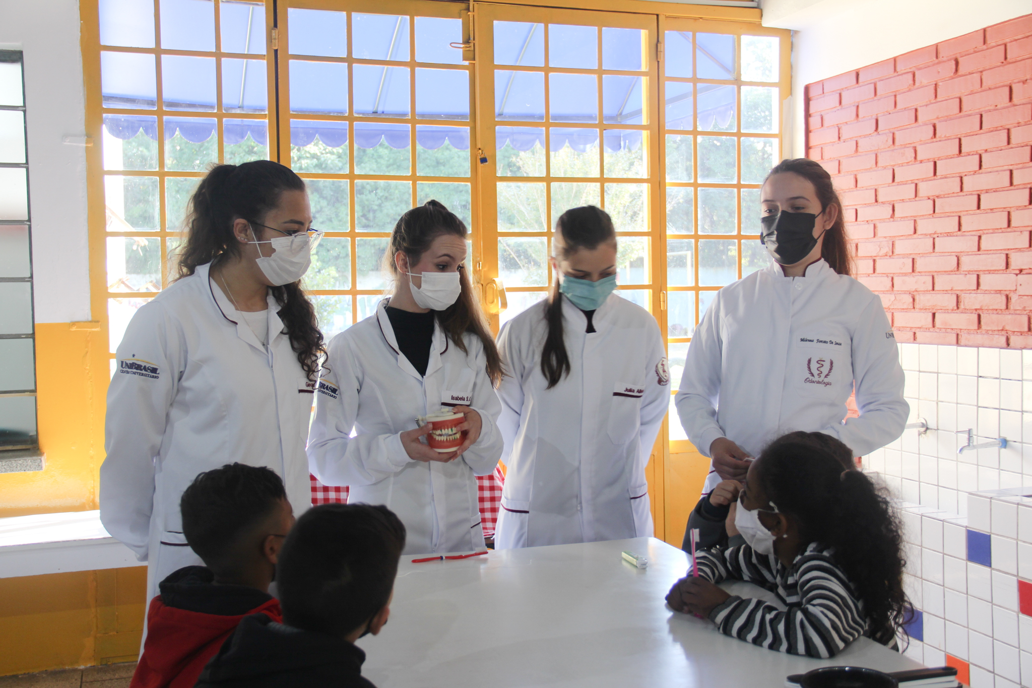 Os acadêmicos do 2º e 3º período do curso de Odontologia realizaram uma ação de orientação sobre higiene bucal e alimentação na Escola Municipal Madre Antônia, para alunos do 1º ao 5º ano, sob orientação do professor Ronaldo Carmona.