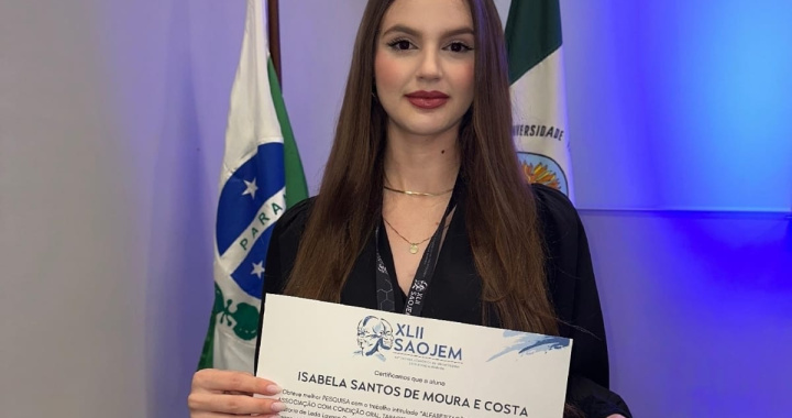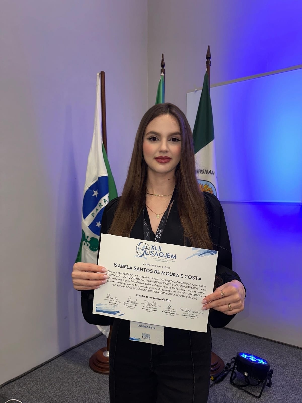 A egressa do curso de Odontologia do UniBrasil Centro Universitário, a cirurgiã-dentista Isabela Moura, conquistou o prêmio de melhor pesquisa de nível pós-graduação durante a Semana Acadêmica de Odontologia Júlio Estrela Moreira (SAOJEM), promovida pela Universidade Federal do Paraná (UFPR), considerada a maior semana acadêmica da área no Sul do Brasil.