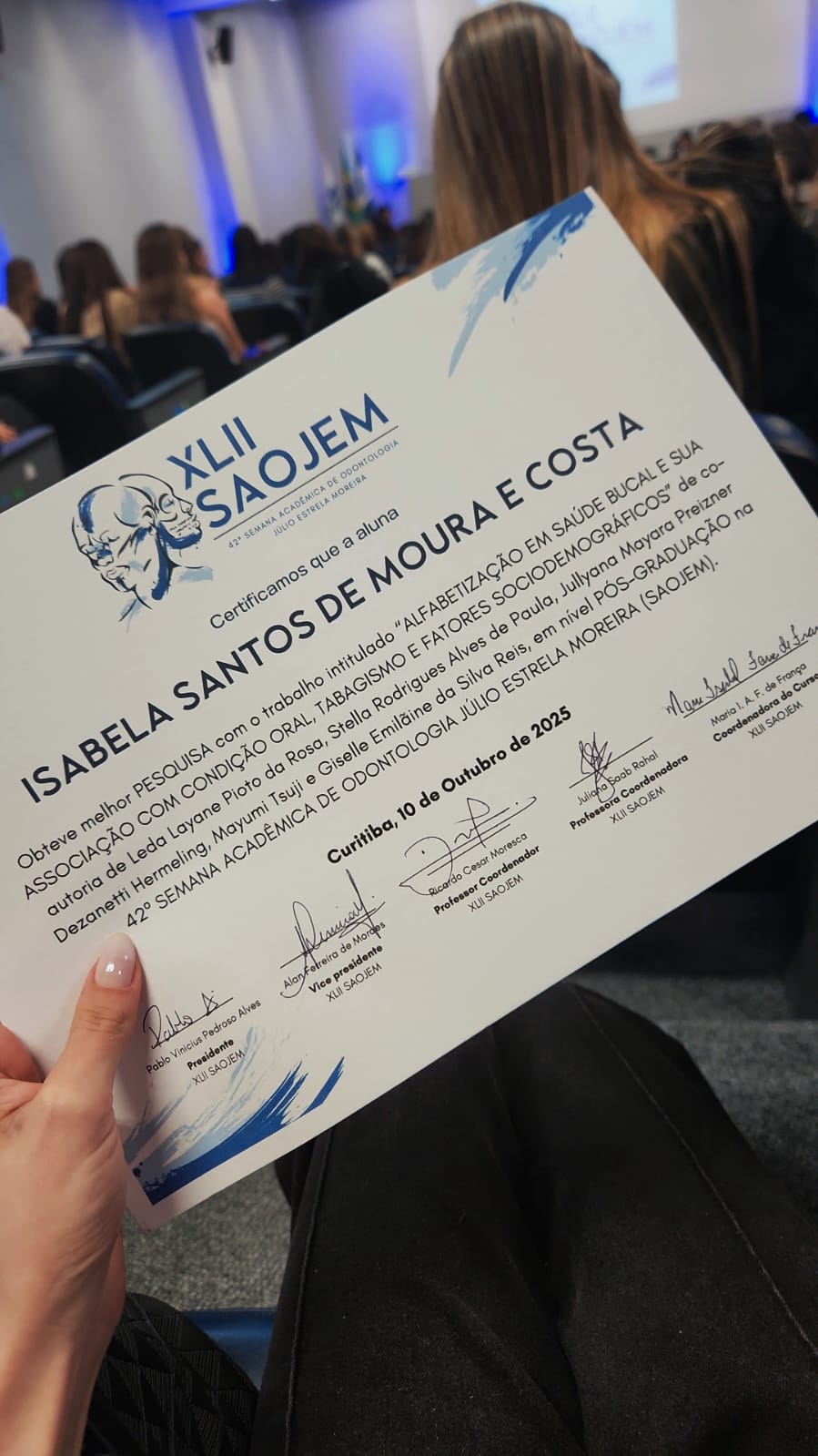 O estudo premiado teve como tema “A alfabetização em saúde bucal e sua relação com a condição oral, tabagismo e fatores sociodemográficos”. A pesquisa investiga como o nível de compreensão das informações sobre saúde influencia diretamente os cuidados bucais e a qualidade de vida das pessoas.