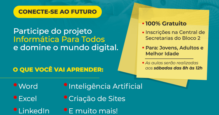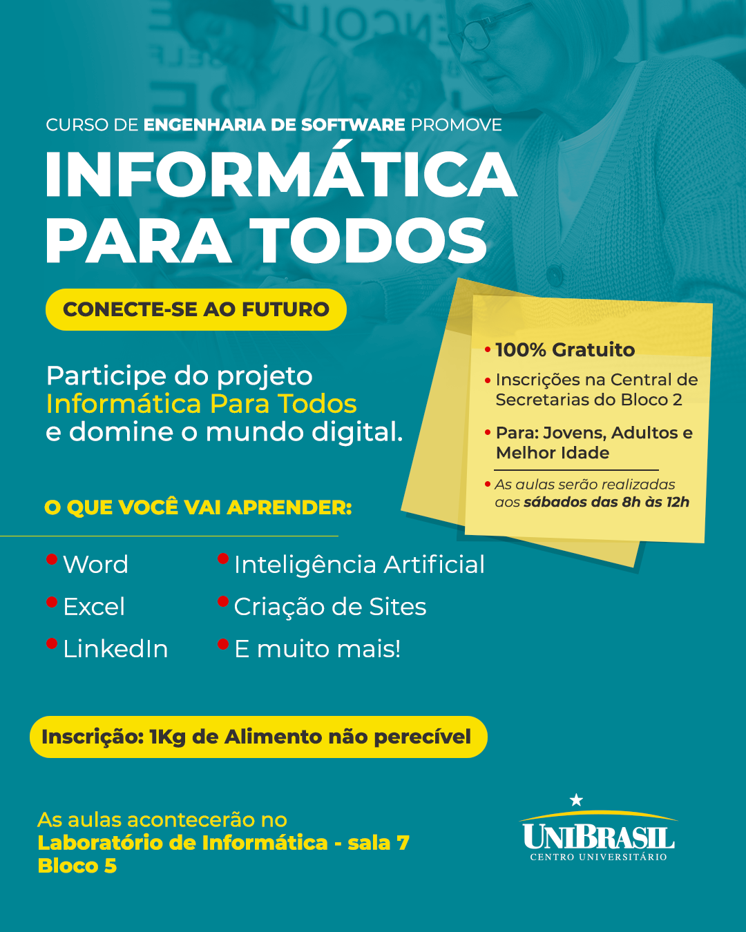 O projeto Informática Para Todos segue em constante evolução, reforçando o compromisso do UniBrasil com a educação como instrumento de transformação social, promovendo inclusão, autonomia e novas oportunidades para a comunidade. As inscrições podem ser realizadas de forma presencial, na secretaria, no térreo do Bloco 2, mediante a doação de 1 kg de alimento não perecível.