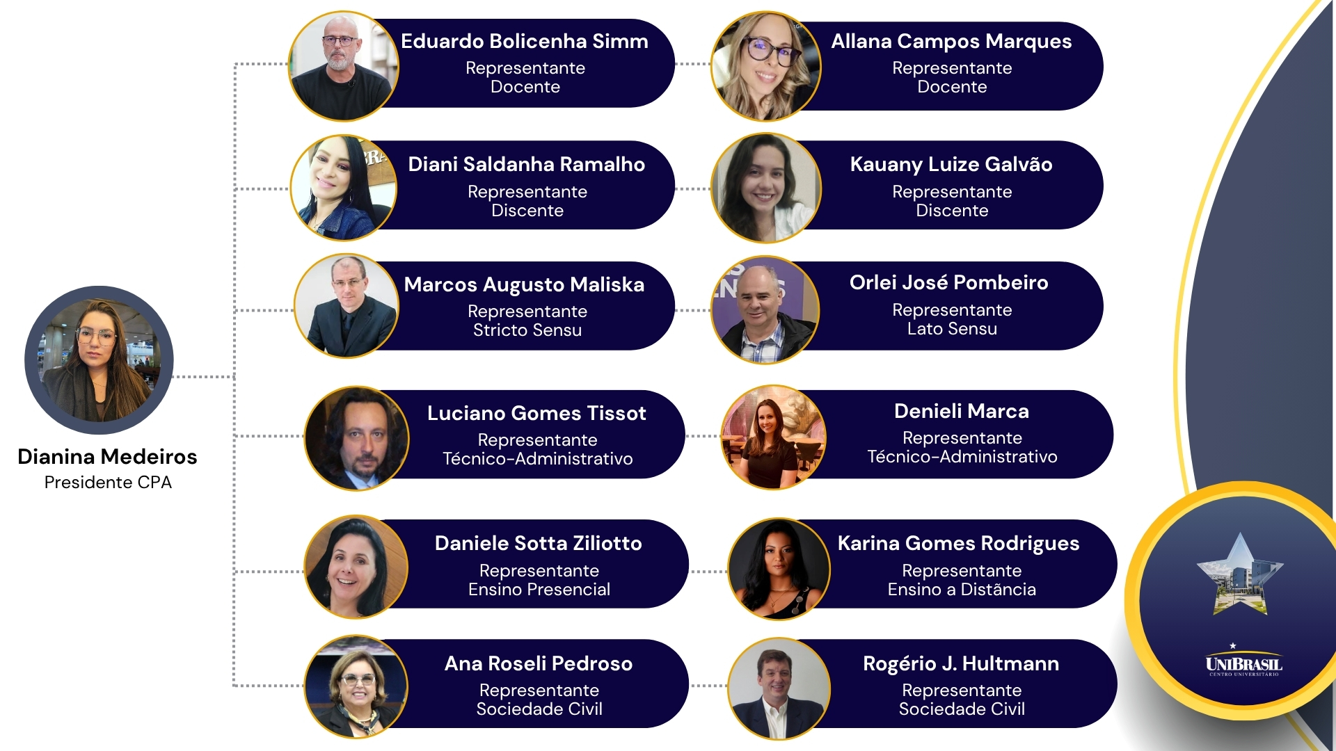A Comissão Própria de Avaliação do UniBrasil, criada em 2004, desenvolve o assessoramento e acompanhamento da execução da política de avaliação institucional, observada a legislação pertinente. A Comissão Própria de Avaliação (CPA) é instituída por Portaria da Reitoria e é composta pelos seguintes membros: