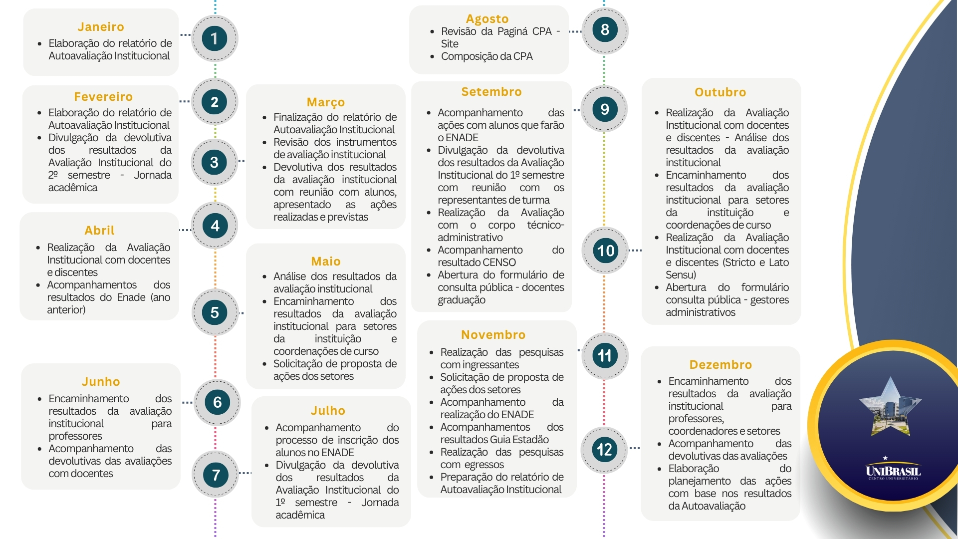 A Comissão Própria de Avaliação (CPA) do UNIBRASIL segue um cronograma anual de atividades, com ações planejadas e distribuídas ao longo do ano para garantir a eficiência do processo de autoavaliação institucional e a participação de toda a comunidade acadêmica.